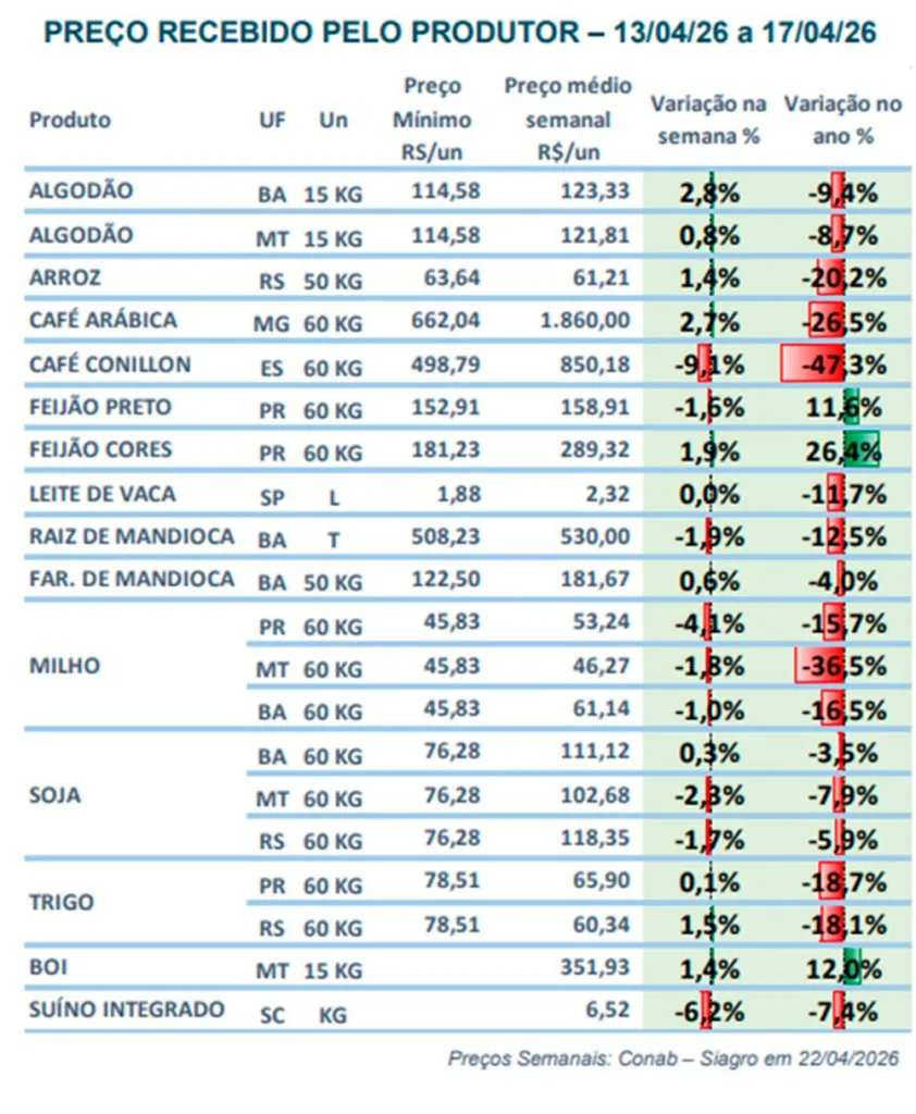 A semana iniciada em 20 de abril foi marcada por preços firmes nos mercados agropecuários, tanto no cenário interno quanto externo, embora a liquidez doméstica ainda se mantenha moderada. É o que aponta a análise da Companhia Nacional de Abastecimento (Conab). Fatores como condições climáticas nos Estados Unidos, oscilações do petróleo, variações cambiais e tensões geopolíticas seguem influenciando diretamente a formação de preços. Ao mesmo tempo, a expectativa de aumento da demanda chinesa trouxe um viés mais otimista para parte das commodities.