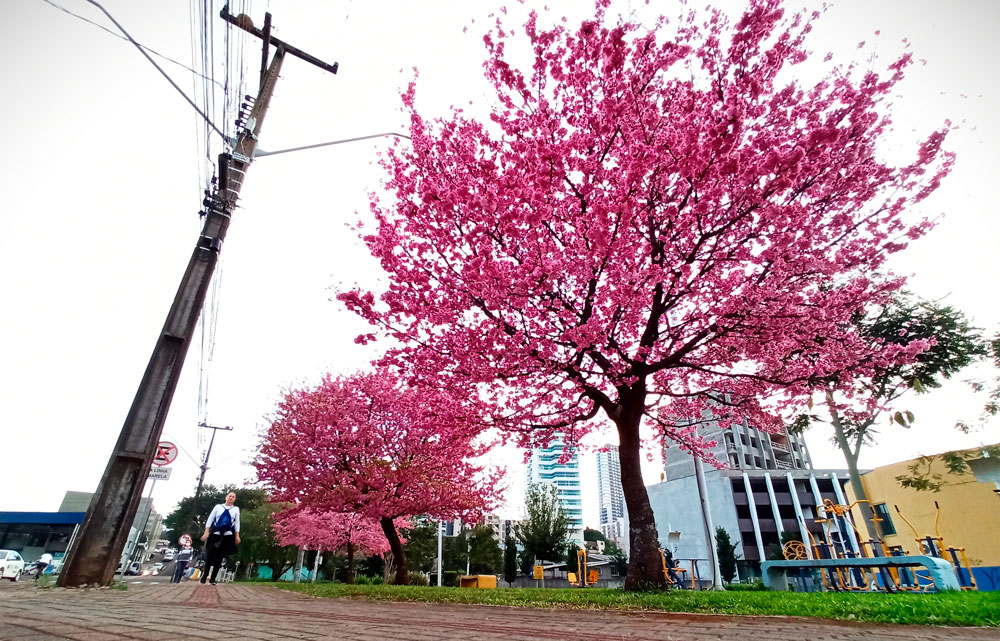 Por Leandro Czerniaski – Três árvores chamam a atenção de quem passa por esses dias pela Praça Darci Zancan, próximo à AABB. São exemplares floridos de cerejeira japonesa, da variedade Sakura Yukiwari. O tom rosado das flores, que preenchem todos os galhos, cria um contraste com o cenário de prédios, asfalto e concreto. Quase um cartão postal, como denominam os mais antigos diante de belas paisagens; ou um espaço ‘instagramável’, segundo os mais dados com a internet.