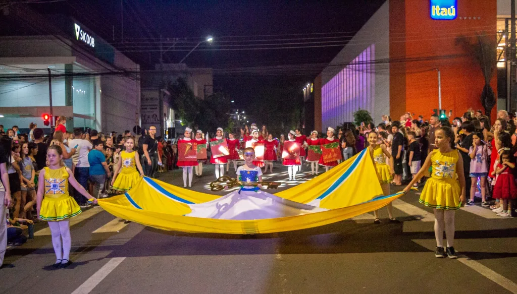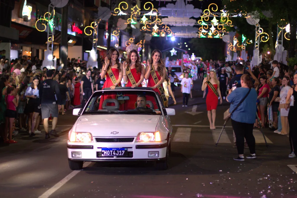 JdeB – Francisco Beltrão abriu na noite de sexta-feira, 28, a programação oficial de Natal com um evento que promete se consolidar no calendário da cidade: o primeiro desfile natalino. A proposta, diferente dos natais passados, levou milhares de pessoas ao Centro e transformou a Tenente Camargo em um corredor iluminado para receber carros alegóricos e centenas de participantes de diferentes grupos da comunidade.