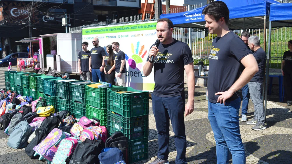 A campanha de arrecadação de materiais escolares promovida pelo Núcleo de Cooperativas de Crédito (NCoop) da Associação Empresarial de Francisco Beltrão (Acefb) terminou na manhã de sábado, 30, com uma ação Dia C de Cooperar no Calçadão Central. Participaram diretores e colaboradores das cooperativas que integram o NCoop e ainda houve a entrega dos produtos para o Sesc, que fará o repasse para as escolas. Cleonir Kuhnen, coordenador do Ncoop, explicou que no Dia dia C “a gente atende ao sétimo princípio do cooperativismo, que é o interesse pela comunidade. E esse ano o Núcleo das Cooperativas de Crédito realizou a campanha da arrecadação de material escolar. Então, hoje nós estamos reunindo todos os materiais que foram arrecadados nas agências, através da contribuição das cooperativas, dos cooperados, da sociedade, dos parceiros que contamos com o Rotary, as escolas, colégios, demais empresas. E entregamos para o Sesc, que vai fazer a preparação, a destinação de todo esse material, para que chegue até as crianças que precisam para iniciar o seu ano letivo e com o material necessário”.