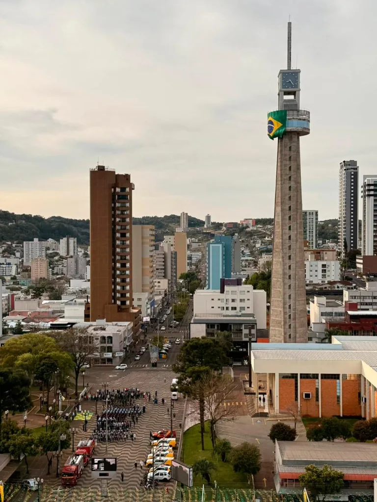Céu nublado nesta segunda-feira, 1º de setembro. Na imagem, se vê a movimentação no Calçadão durante a cerimônia de abertura da Semana da Pátria. (Foto de Vera Schmitz)