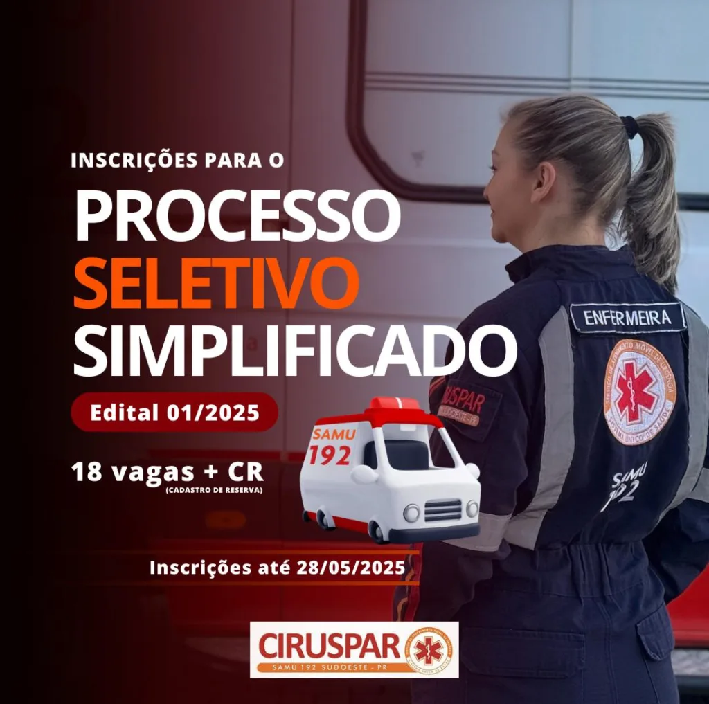 Continuam abertas as inscrições para o Processo Seletivo Simplificado (PSS) 1/2025 do Serviço de Atendimento Móvel de Urgência (Samu) do Sudoeste do Paraná. As vagas são destinadas a diferentes áreas, com oportunidades para os seguintes cargos: auxiliar de serviços gerais, condutor socorrista, enfermeiro socorrista, médico regulador e médico intervencionista. A inscrição é gratuita e deve ser realizada até amanhã, exclusivamente por meio eletrônico. O processo seletivo tem como objetivo a contratação por tempo determinado e a formação de cadastro de reserva para atuação em sete municípios do Sudoeste: Ampére, Dois Vizinhos, Itapejara d’Oeste, Palmas, Pato Branco, Planalto e Salto do Lontra. Em caso de dúvidas ou problemas técnicos com o formulário de inscrição, o candidato deve entrar em contato pelo WhatsApp (somente mensagens) 46-9-8404-2423, relatando a ocorrência e, se for o caso, anexando imagens que comprovem o erro.