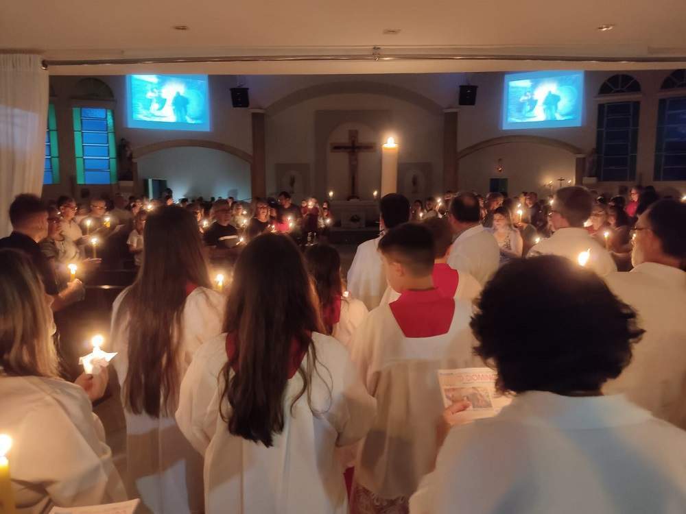 Foi o que aconteceu neste sábado, na matriz São José da Vila Nova. Havia vários batizados e a missa, iniciada às 19 horas, terminou às 21, com uma salva de palmas para os novos cristãos, agora batizados, recebidos pela comunidade católica.