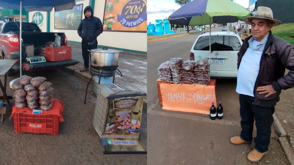 Outro vendedor, Neri Medeiros, está em sua primeira temporada no comércio de pinhão. Aos 74 anos, ele conta que vê na atividade uma oportunidade compatível com sua realidade, por ser aposentado e já ter enfrentado problemas de saúde. Trabalha em parceria com um comerciante de Candói, que fornece o produto e mantém dois pontos de venda em Beltrão.