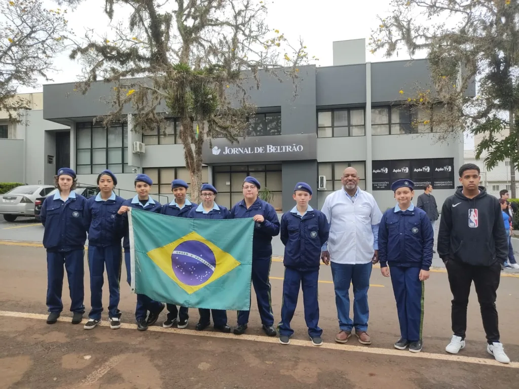 Alunos do Colégio Cívico Militar Professor Vicente de Carli aguardando para o desfile deste domingo: Victória, Maria Clara Santos de Souza, Maysa Miranda Lopes, Eloá Carolina Costa, Jéssicda Blásius, Letícia Blásius, Kaleu Elijah, professor Lécio Luiz, Maria Júlia Rocha e Eduardo Luiz.