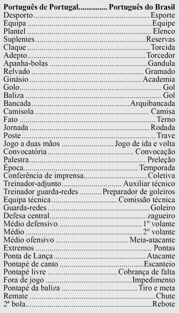 Como o livro é muito extenso, o que vou compartilhar com vocês são as diferenças de nomenclaturas do futebol do Brasil e de Portugal, um levantamento feito por Abel Ferreira que é muito interessante.