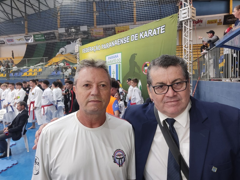 Francisco Pereira, da Associação Garra de Karatê de Dois Vizinhos, e o presidente da Federação Paranaense de Karatê, Celso Rebis.