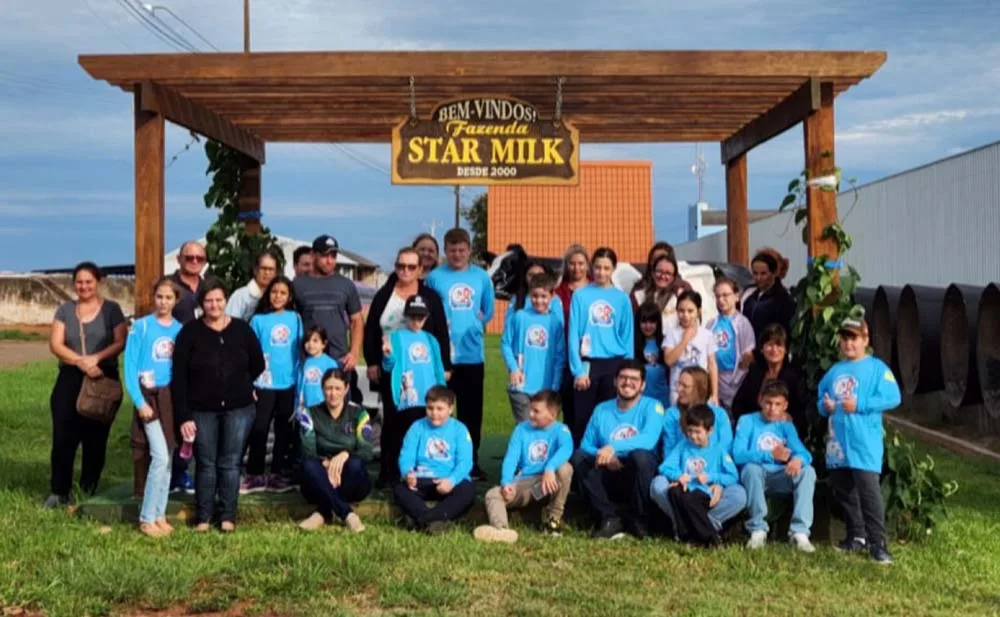 As crianças que participaram da viagem técnica até Céu Azul. O grupo conheceu a operação da Fazenda Star Milk, referência no setor, com uma produção de 30 mil litros de leite por dia.