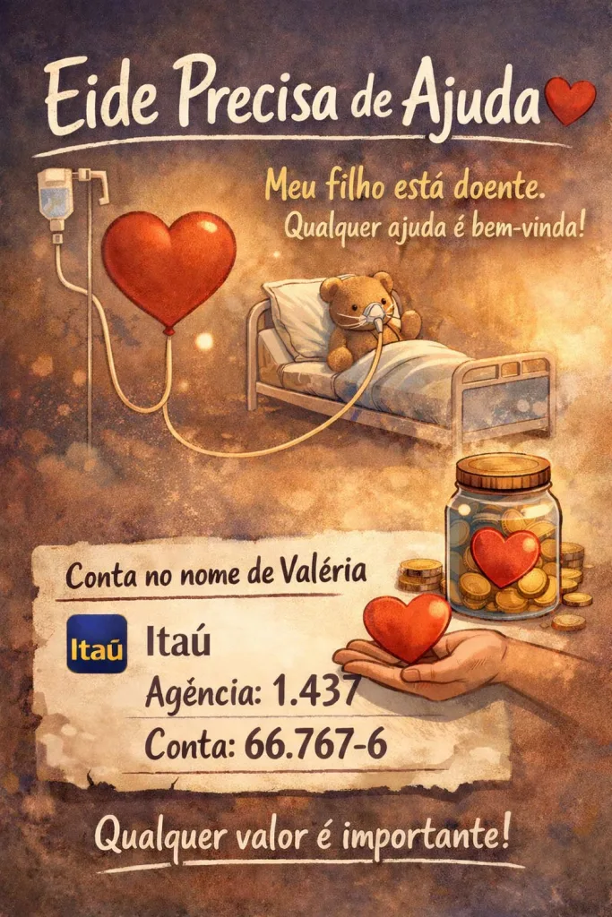 Geral Eide precisa de ajuda Ivo Pegoraro 16/04/2026 08:55 Por ter um filho doente, Eide de Amorin está precisando de ajuda financeira. Ela aceita qualquer valor que as pessoas possam doar. A conta está no nome de sua mãe, Valéria. - Publicidade - É do Itaú, agência 1.437, de Francisco Beltrão, conta número 66.767-6. Tagsajuda financeiraDoaçãoEide de AmorinFamíliaFrancisco Beltrãosolidariedade Compartilhe FacebookXWhatsApp ARTIGOS RELACIONADOS Valdir Ramos: a voz da Hora do Mate na Educadora 26/04/2026 00:30 Paraná tem melhor destino de Ecoturismo 25/04/2026 15:00 Lideranças empresariais prestigiam posse de Cláudio Cauduro 25/04/2026 12:00 DEIXE UMA RESPOSTA Cancelar resposta Comentário: Por favor digite seu comentário! Nome:* Por favor, digite seu nome aqui E-mail:* Você digitou um endereço de e-mail incorreto! Por favor, digite seu endereço de e-mail aqui Site: Salve meu nome, e-mail e site neste navegador para a próxima vez que eu comentar. Destaques Agricultura Produtor de leite de Verê migra de produção Agricultura Queijaria São Gabriel conquista Ouro no Mundial do Queijo Regional Comunidade se despede do empresário Vilmar Brufati