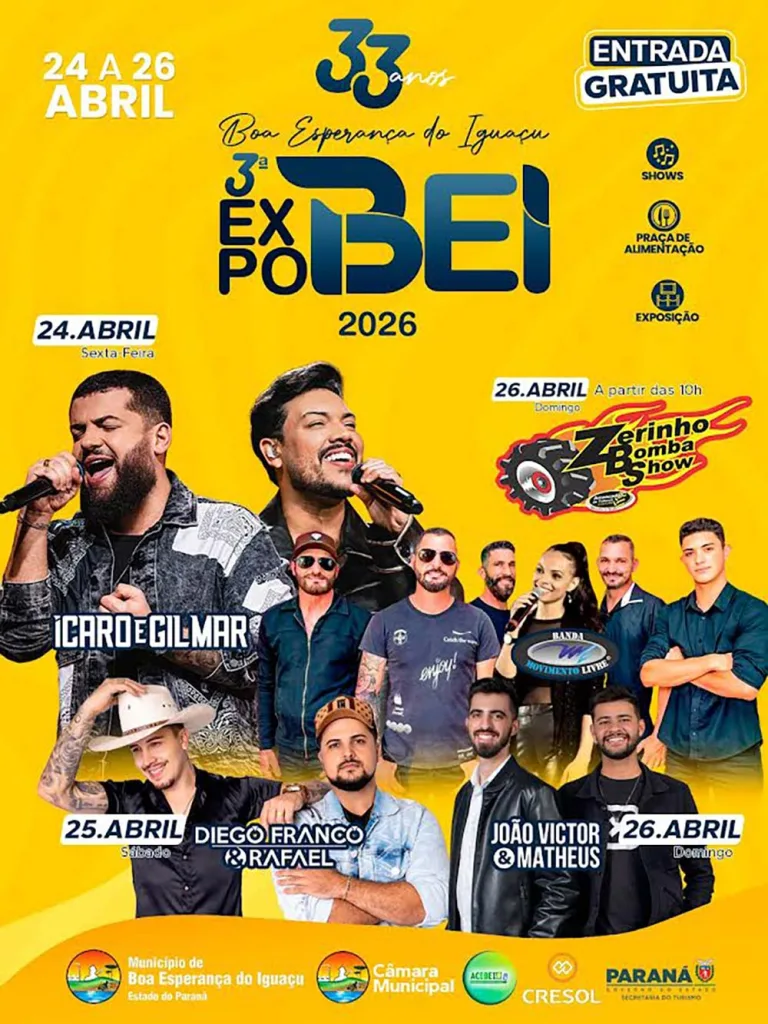 Nesta sexta-feira, 24, a partir das 19h, começa a 3ª ExpoBei, em Boa Esperança do Iguaçu. A feira foi pensada para celebrar os 33 anos de emancipação do município e é realizada por meio de parceria entre o poder público, a Associação Empresarial (Acebei), com apoio do Governo do Paraná e da Cresol. A programação é extensa e conta, nesta noite, com dois shows: às 21h30, apresentação da banda Movimento Livre, no Palco 1, e, às 23h, os sucessos dos sertanejos Ícaro e Gilmar, no Palco 2.