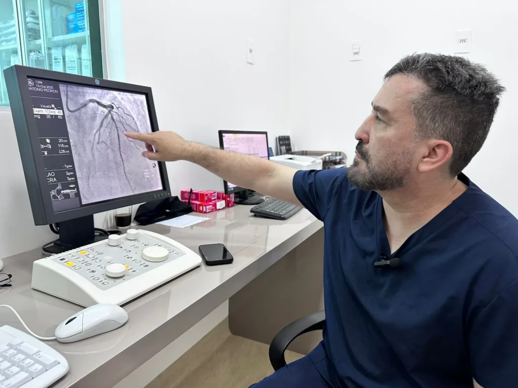 “Nós normalmente só indicamos a angioplastia pra lesões acima de 70% de obstrução. Normalmente os pacientes têm algum sintoma ou fazem exames como o ecostress, a cintilografia ou a angiotomografia, mostram alterações nesses exames, e aí é indicado fazer o cateterismo. Que só aí conseguimos ver a quantidade de lesões, se são graves ou não, e em lesões que temos dúvida, usamos esses indicadores de fluxo pra fazer ou não o procedimento. Tem vezes que a gente faz o cateterismo, mas não é indicada a angioplastia, então em cada caso é avaliado o melhor procedimento”, afirma o médico, que lembrou que muitas pessoas confundem o cateterismo com a angioplastia, que são dois procedimentos diferentes: “O cateterismo não é um tratamento, é outro exame em que conseguimos fazer um diagnóstico preciso da quantidade e, principalmente, do grau de obstrução que se tem.”