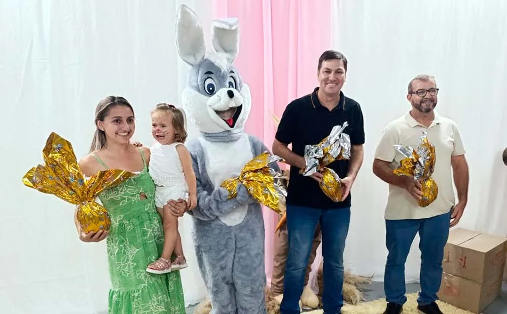 No Centro Municipal de Educação Infantil Criança Esperança, o prefeito Giva e o vice Bianchini, acompanhados de vereadores e da diretora Aline Antunes Correa de Souza, entregaram os chocolates e assistiram às apresentações de Páscoa feitas pelos alunos, professoras e equipe.
