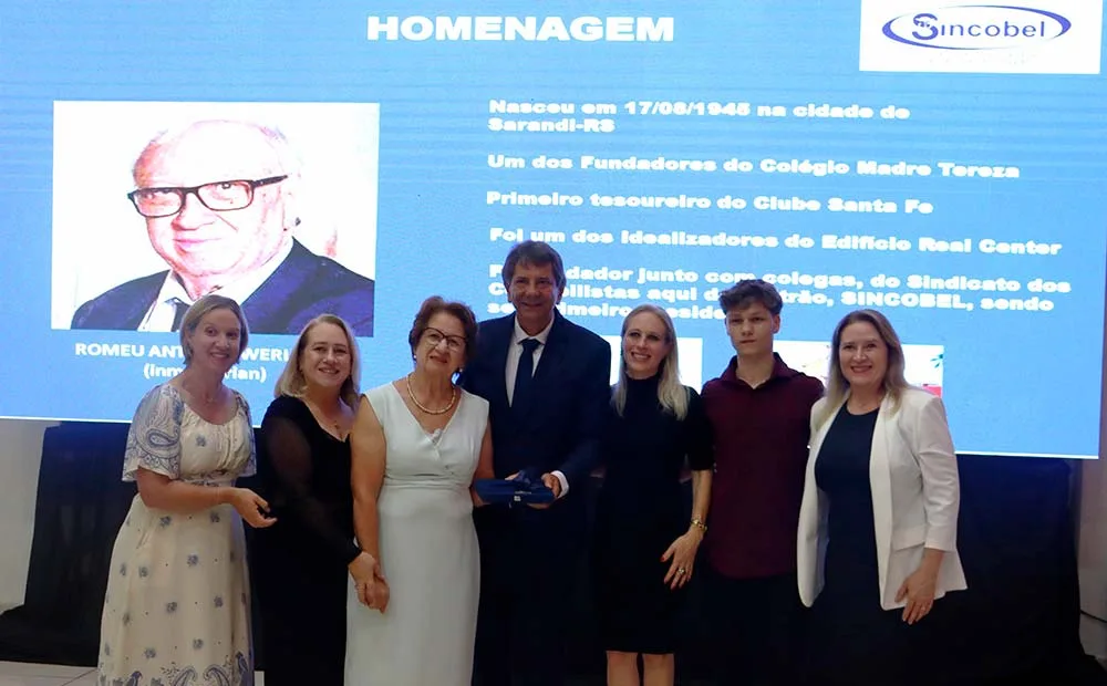 A noite também foi de homenagem. A família de Romeu Werlang, um dos fundadores do Sincobel e primeiro presidente da entidade, recebeu uma placa que reconhece os serviços prestados pelo contabilista à instituição e desenvolvimento de Beltrão.