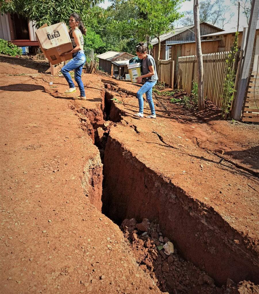 No terreno, é como se o chão tivesse “estufado” e há diversas rachaduras em diferentes pontos. Por segurança, ela saiu com os três filhos e a neta, conseguindo retirar parte dos móveis. Algumas vezes por dia volta pra ver como está a casa, mas não quer estar no local quando tudo vier abaixo.
