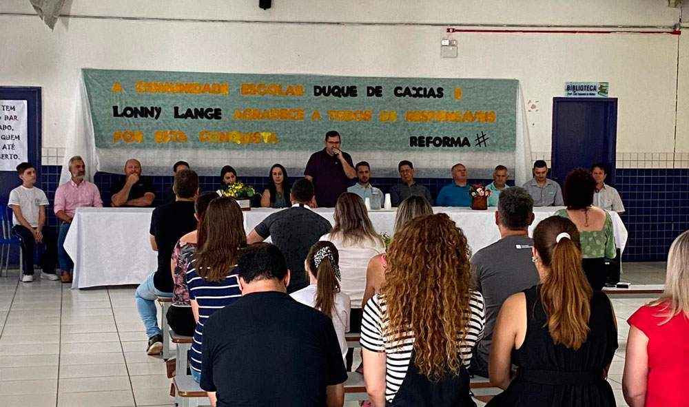 Por Alexandre Bággio – Uma solenidade na manhã de ontem, 20, marcou o repasse de R$ 896,5 mil do Governo do Estado para reforma na Escola Estadual Duque de Caxias. O espaço funciona em dualidade com a Escola Municipal Lonny Lange. As melhorias abrangem troca no telhado, da calçada, troca total da parte elétrica e dos pisos das salas de aula. O evento contou com a presença do deputado federal Paulo Litro (PSD), do deputado estadual Adão Litro (PSD), do prefeito Carlinhos Turatto (PP), diversos secretários municipais, vereadores, alunos, pais e professores.