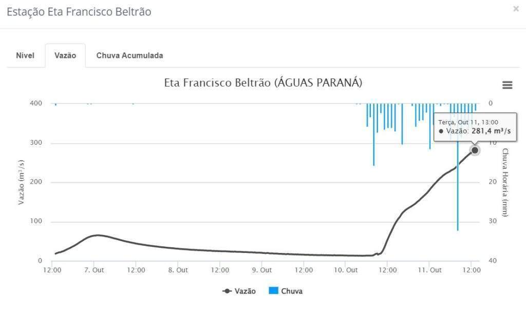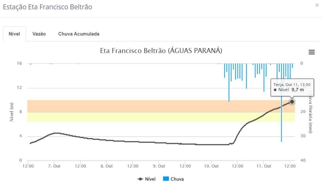 O Marrecas vem enchendo de forma significativa desde a tarde de ontem, conforme mostram os gráficos do Simepar.