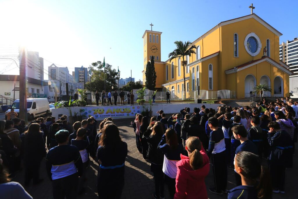 O evento na Praça Presidente Vargas contou com a presença de secretários municipais, vereadores, alunos das escolas municipais e Fundabem, além da vice-prefeita Angela Padoan e do prefeito Robson Cantu. “É um orgulho viver em uma nação e em uma cidade tão próspera como Pato Branco. Valorizamos o trabalho dos nossos pioneiros e estamos construindo um futuro brilhante para as novas gerações”, salientou o prefeito Robson Cantu. Foi executado o Hino Nacional, hasteamento das bandeiras e no encerramento da solenidade teve a apresentação das ginastas participantes do projeto de Ginástica Rítmica da Prefeitura com apoio do Instituto Teóphilo Petrycoski.