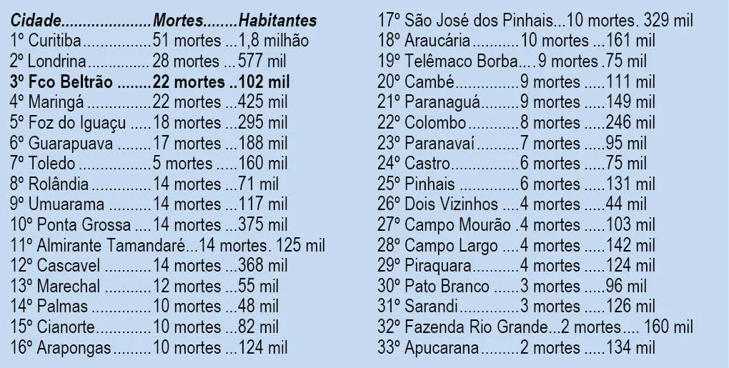 2025 – 22 mortes, 2024 – 12 mortes, 2023 – 28 mortes, 2022 – 21 mortes, 2021 – 14 mortes, 2020 – 7 mortes, 2019 – 13 mortes.