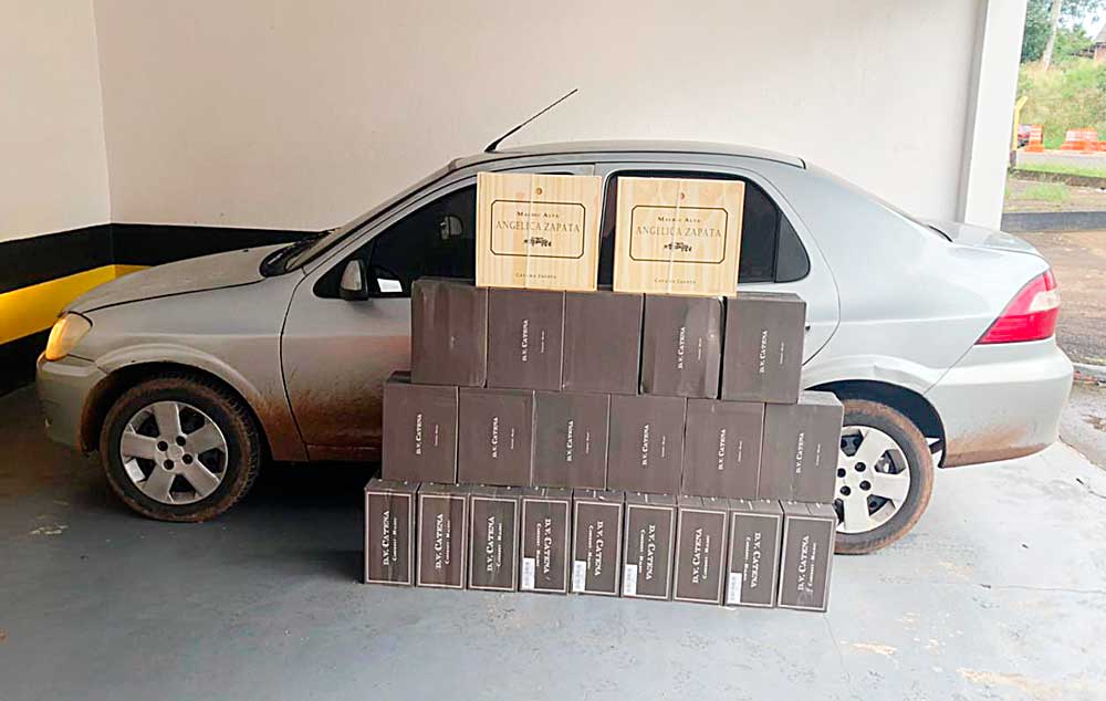 Na tentativa de abordagem, o condutor fugiu, entrou em uma estrada vicinal e abandonou o carro, fugindo a pé em meio a uma plantação. O carro estava carregado com 22 caixas de vinhos (128 garrafas). A mercadoria e o carro foram apreendidos.