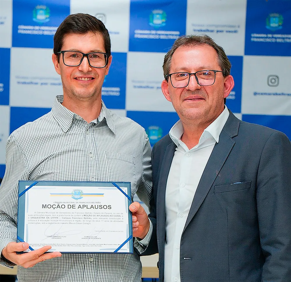 Para celebrar os 12 anos de atuação, a Câmara de Vereadores de Francisco Beltrão homenageou com a Moção de Aplausos a Orquestra e Coral da UTFPR (Universidade Federal Tecnológica do Paraná), campus Francisco Beltrão, através de iniciativa do vereador Silmar Gallina (PSDB). A concessão da honraria foi aprovada por unanimidade. A entrega aconteceu na sessão de terça-feira (23).