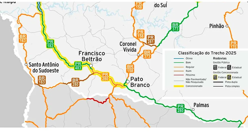 Na região Sudoeste, a pesquisa percorreu cerca de 630 km de rodovias. Entre os trechos analisados estão importantes corredores logísticos, como as BRs 163 e 280, de Capanema a Marmeleiro; a PRC-280, de Realeza a Palmas; e a BR-373, de Pato Branco ao Rio Iguaçu. O estudo foi realizado em 2025.