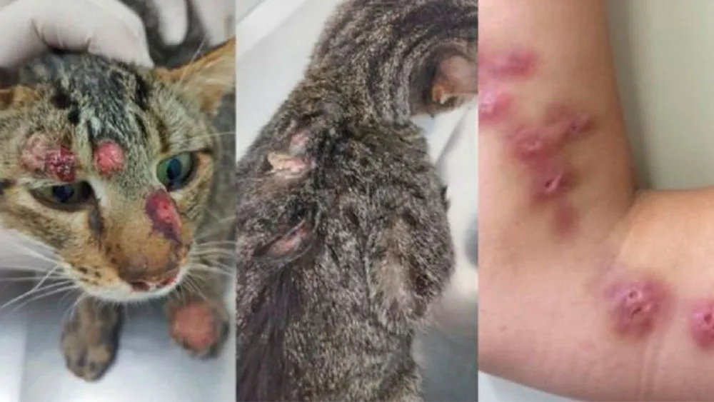 Nos gatos, as lesões de pele costumam aparecer no nariz, membros e cauda, com inchaços endurecidos na região do focinho, podendo ser acompanhadas de espirros. As feridas podem se espalhar por todo o corpo do animal.