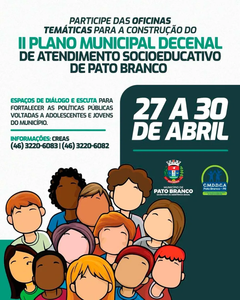 A Prefeitura de Pato Branco, por meio da Secretaria Municipal de Assistência Social, promove até quinta-feira, 30, as oficinas temáticas para a construção do II Plano Municipal Decenal de Atendimento Socioeducativo de Pato Branco (2026–2036).